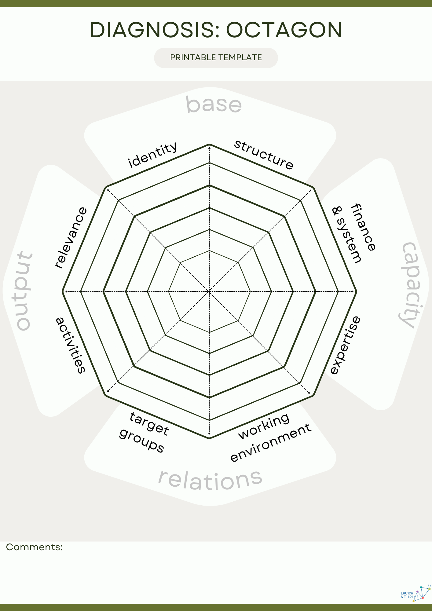 The eight variables form an octagon. Each dimension is ranked by assessments of two statements/questions on a six-point scale. When all the variables have been analyzed and ranked, the organization’s development profile is illustrated in the form of an octagon.